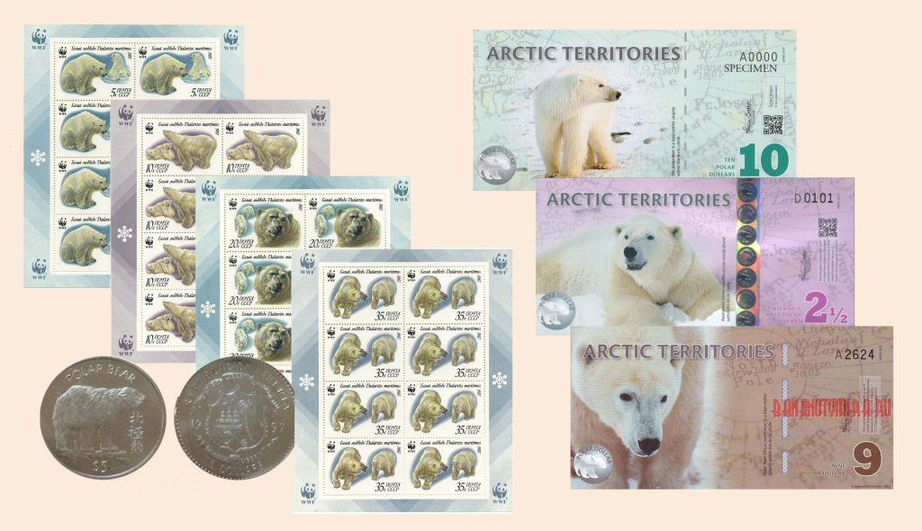 Помимо фарфоровой миниатюры мы вам можем предложить монету с изображением полярного мишки 5 долларов 1997 г. Либерия и боны США — «Арктические территории» 10 долларов 2010, 9 долларов 2012, 2,5 доллара 2013 гг.